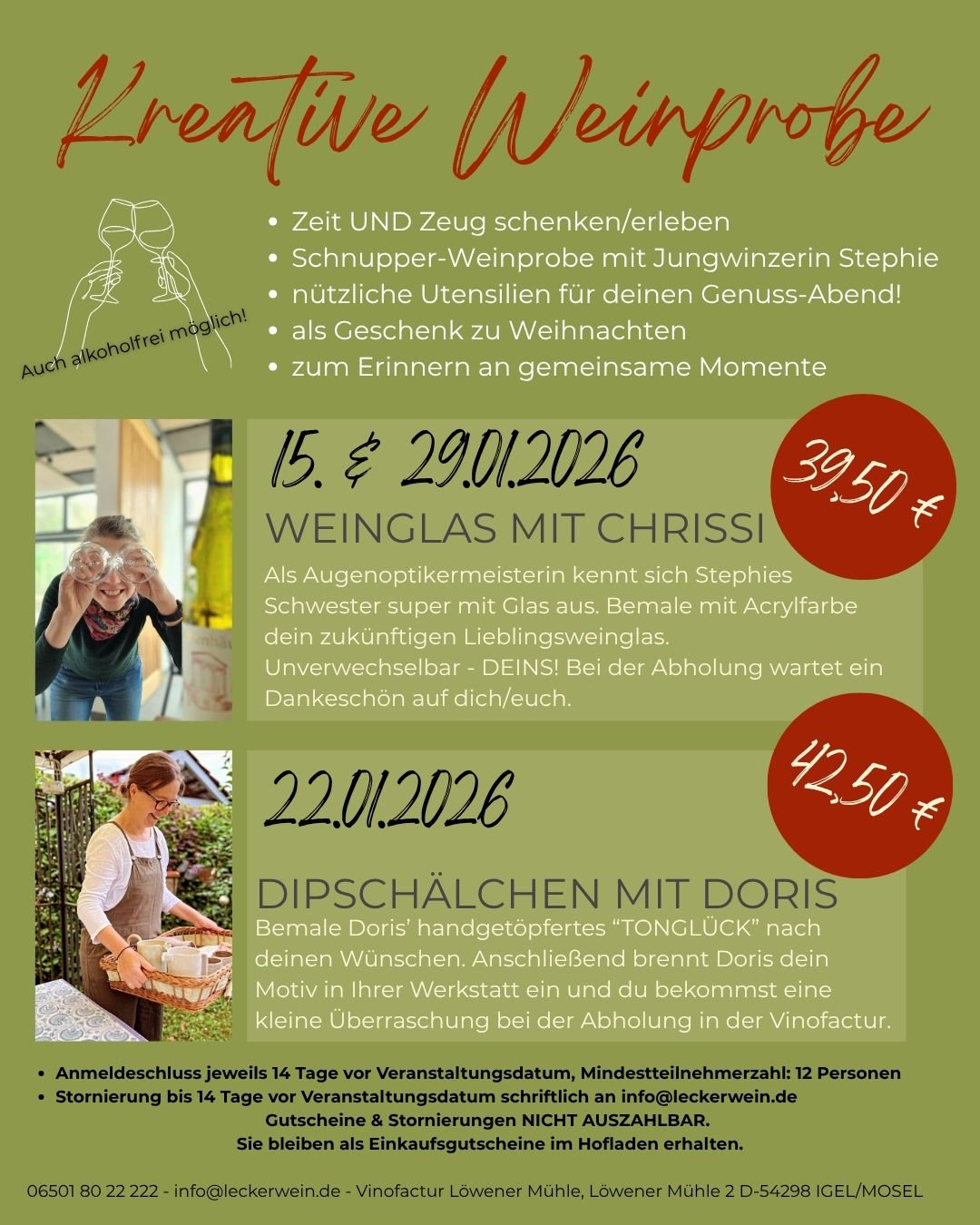 Unsere Kreative Weinprobe! Mit der besten Freundin, Mama oder dem Busenfreund mal einen schönen Nachmittag bei uns verbringen? Im Januar ist doch sowieso nichts los 😉 Also freut euch auf eine Schnupper-Weinprobe mit kreativen Ergbnissen. Meldet euch ab sofort an – wir schreiben auch gerne Gutscheine. Noch Fragen? Dann mailt mir gerne an info@leckerwein.de
