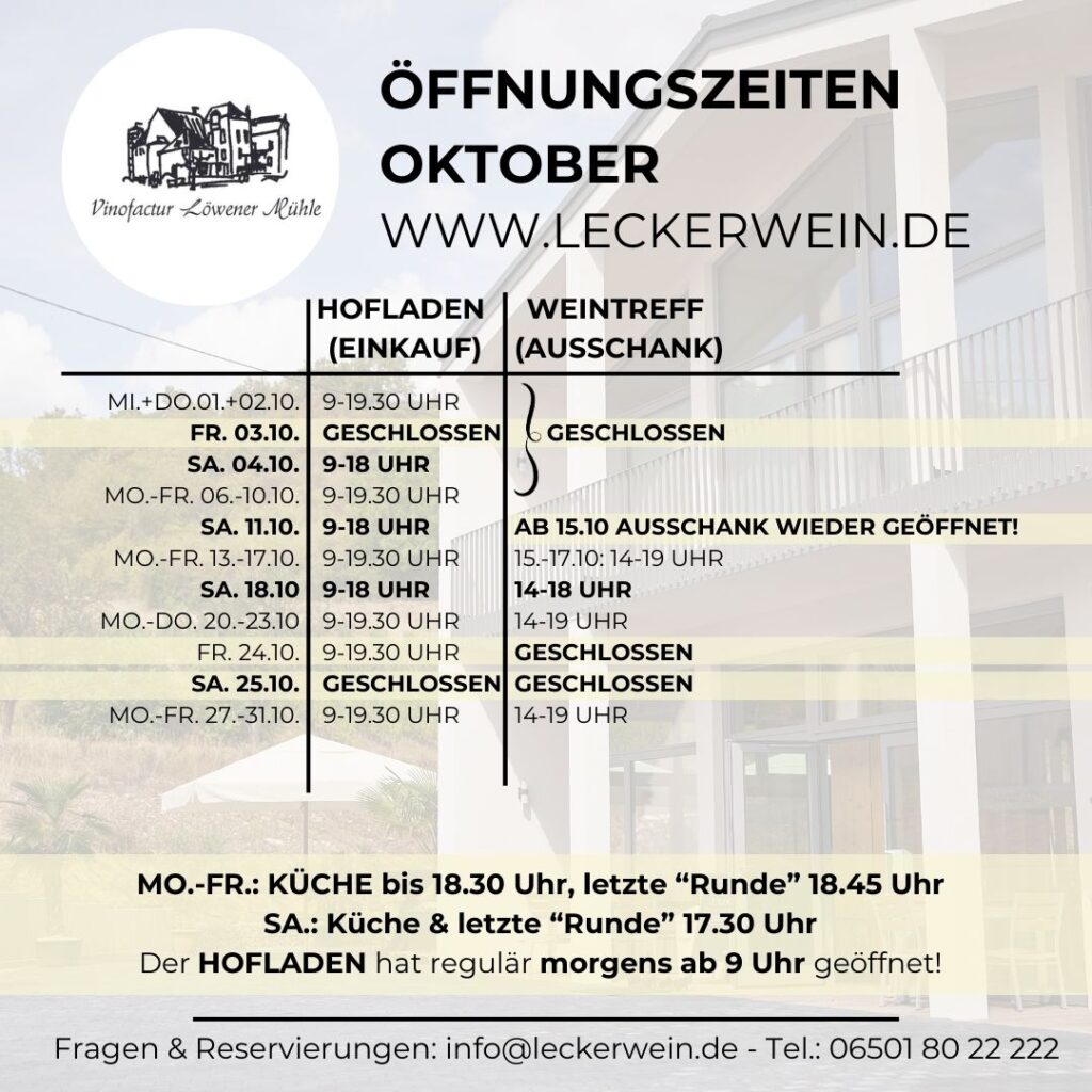 Ab dem 15. Oktober haben wir wieder unseren WeinTreff für Sie geöffnet. Der Hofladen hat wie gewohnt offen. Alle weiteren Öffnungszeiten des Monats finden Sie unten. Außerdem haben wir wieder unseren leckeren Winzerglühwein im Hofladen. Wie jedes Jahr haben wir nur den “feinsten Stoff” darin verarbeitet. Wem also abends schon etwas frisch ist, findet bei uns die passende “Wärmflasche” 🙂 …Unseren alkholfreien Apfelpunsch haben wir auch schon im Regal 😉